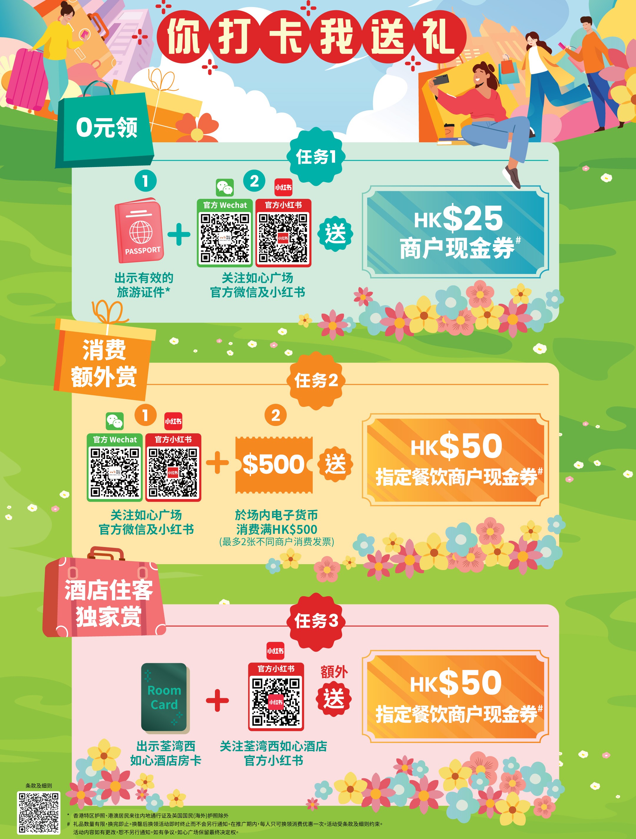旅客親臨換領地點向禮賓部職員出示有效旅遊證件^,並關注「香港如心廣場」官方微信及小紅書帳號,即可換領「指定商戶$25現金券」一張。 |