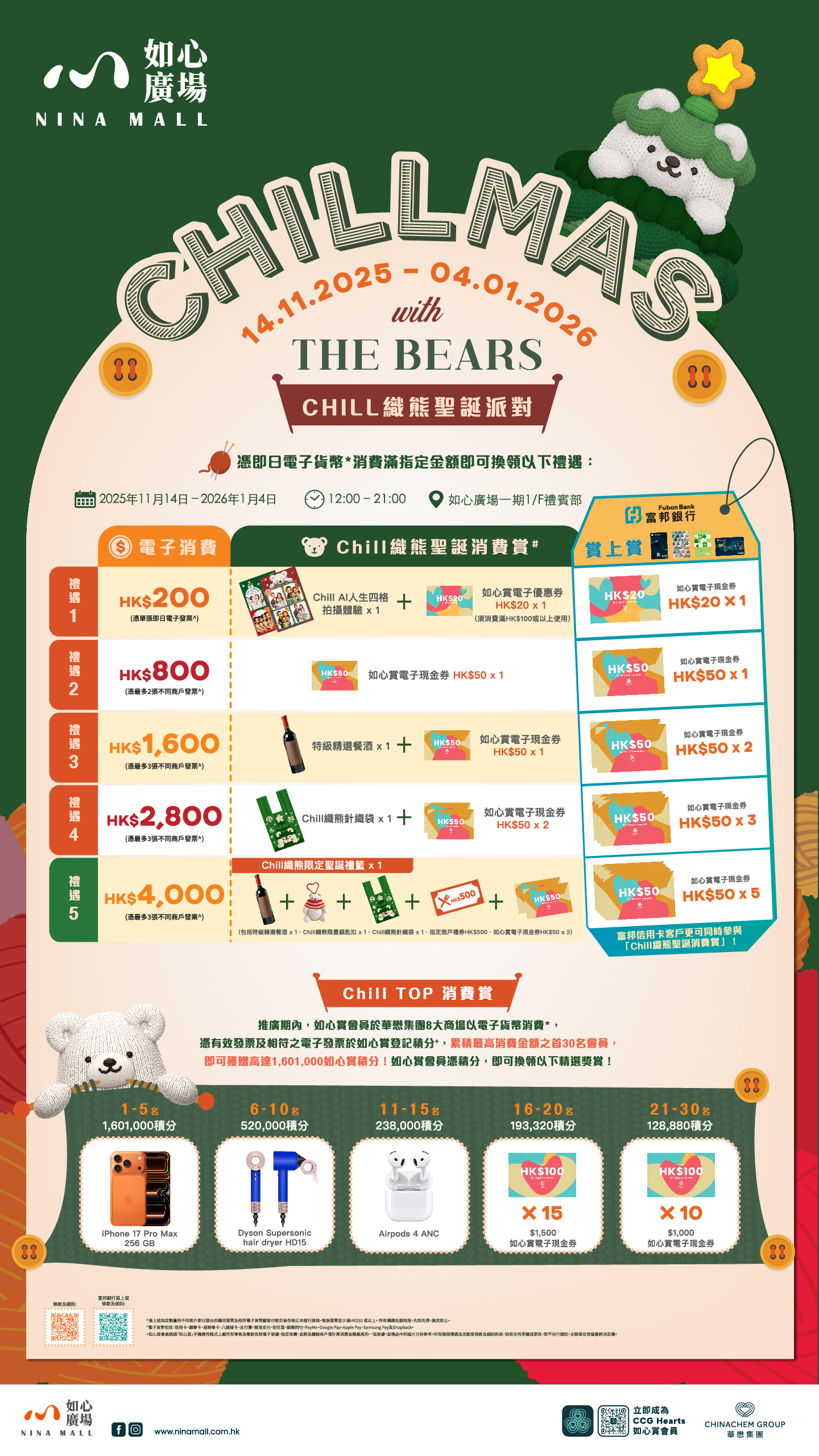 Across 8 Chinachem malls, the “Chill Top Rewards” program offers even more excitement! The top 30 members with the highest accumulated spending will have the chance to earn up to 1,601,000 points, redeemable for grand Christmas prizes such as the iPhone 17 Pro Max 256GB, Dyson Supersonic™ Hair Dryer HD15, AirPods 4 ANC, and CCG Hearts e-cash vouchers worth up to HK$1,500!
