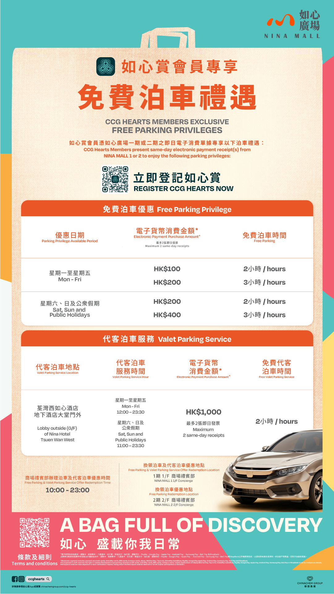 NINA MALL also provides valet parking service. For details, please contact the concierge outside the Nina Hotel lobby or inside the shopping mall.